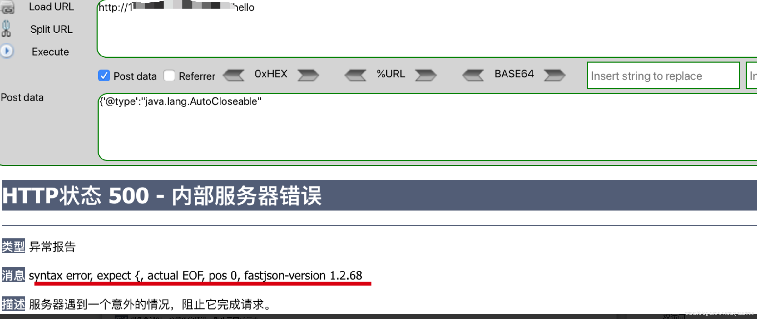 2、返回HTTP 500,且关键字为fastjson或jackson,可证明为fastjson或jackson